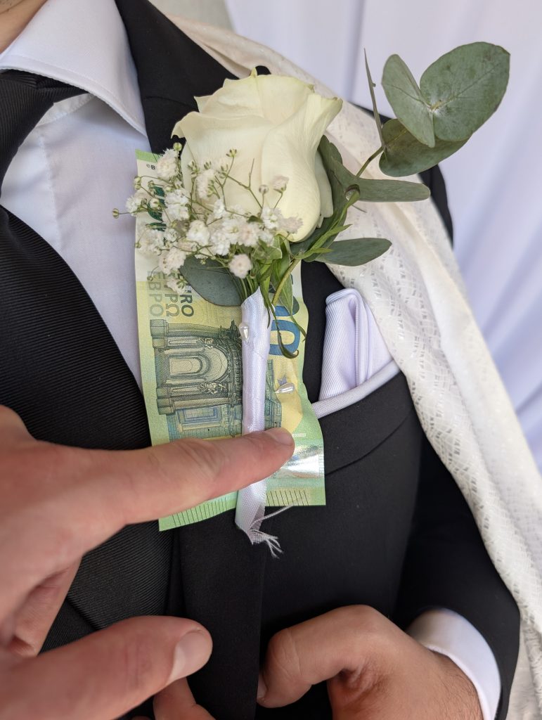 După ce mirele a fost pregătit și aranjat, a venit momentul să punem florile în piept. Ce am aflat doar în ultimul moment e că noi, nașii, trebuie să punem și bani în piept mirelui. Bani aveam la mine, dar nu aveam bancnote mari, nu puteam pune 200 lei în piept. Am căutat un pic să văd dacă găsesc măcar „un Eminescu” de 500 lei, dar fără scucces. Așa că am profitat de un moment când a trebuit să scot niște bani de pe card, am trecut pe la un schimb valutar și am schimbat 100 de euro. Mirele era pregătit acuma de nuntă.